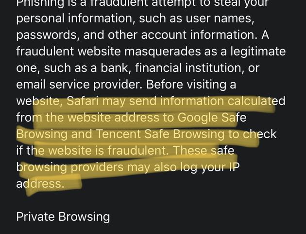 有用户发现,在苹果的Safari的隐私条款中有一个特别的条款。叫做 Fraudulent Webstie Warning ,欺诈网站警告。内容原文是这样描述的,“Before visiting a website, Safari may sen information calculated from the website address to Google Safe Browsing and Tencent Safe Browsing to check if the website is fraudulent。 These safe browsing providers may also log your IP address。”