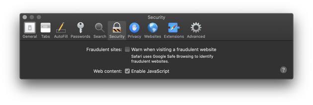 在Mac中 Safari 设置中安全设置,Fraudulent Site 欺诈网站警告这里取消此功能即可。
